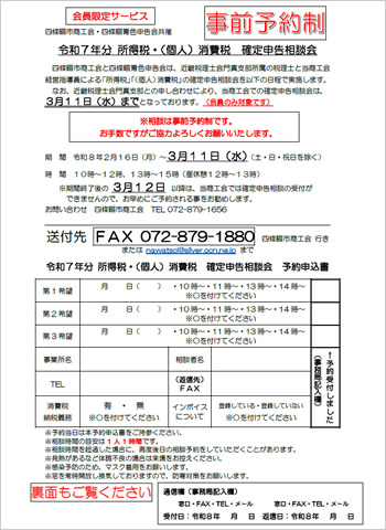 近畿税理士会門真支部との申し合わせにより、当商工会での確定申告相談会は 3月11日(水)までとなっております(会員のみ対象です) なお、 3月12日(木)以降は、当商工会では確定申告相談の受付ができませんので、お早めにご予約される事をお勧めします。